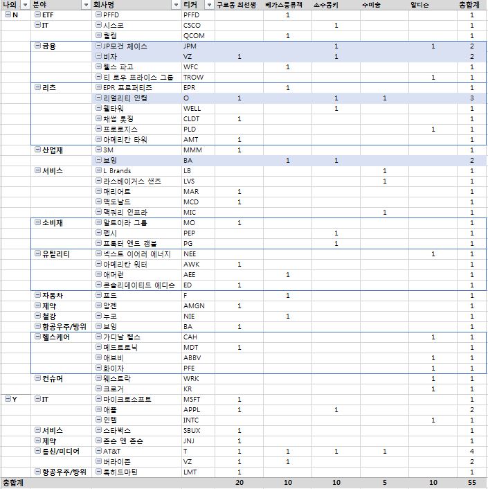 그들이 보유한 종목으로 책에서 언급한 기업들을 정리해보고, 나의 포트폴리오와 비교해보았다. (내가 몸 담고 있는 업의 특성 때문인지) 나의 포트폴리오가 편중되어 있다는 느낌이 들어 새로 투자할 기업들을 찾고 있던 차라, 동 내용을 참고하여 공부해갈 생각이다. 지금 관심 있는 분야들은 금융/리츠/소비재/유틸리티/헬스케어!