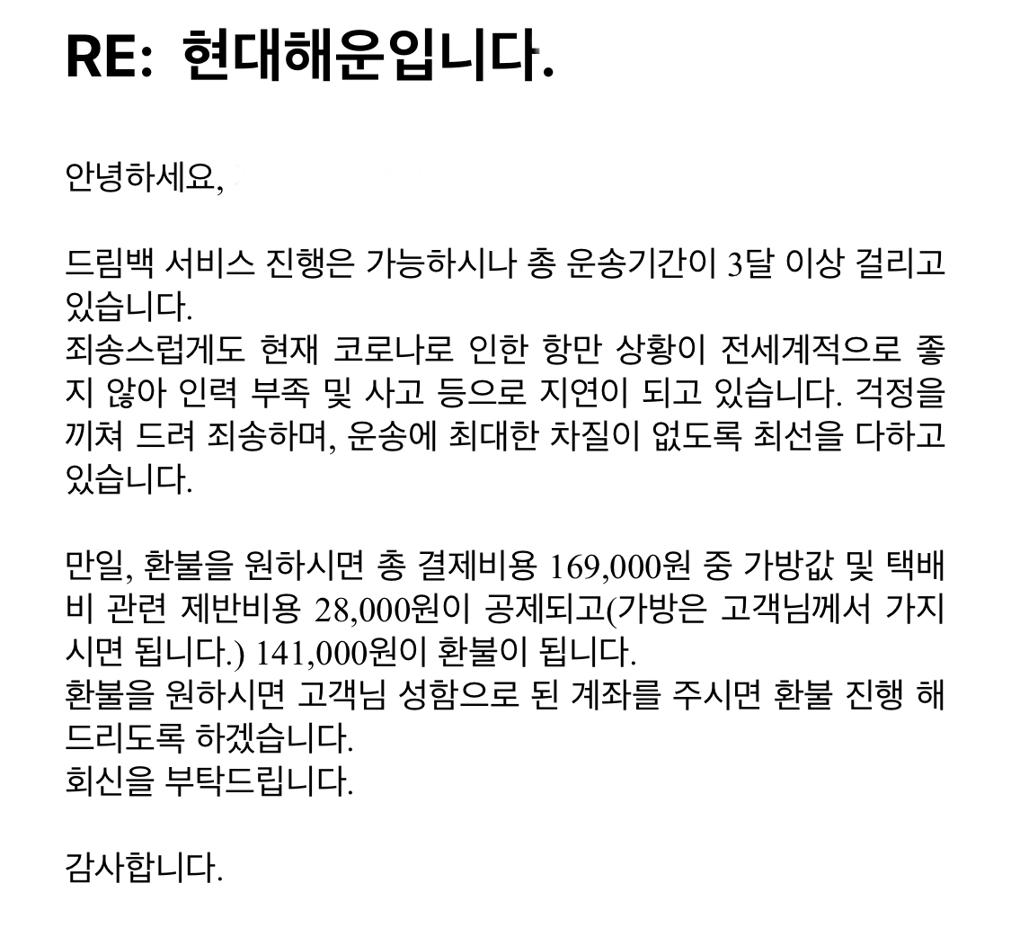 원래는 1-2개월 정도면 받을 수 있다고 들었는데, 지금 코로나 여파에 중국 상해 근처 선박 충돌 사고로 배송기간이 3개월 이상 걸릴 수 있다고 한다. 이미 드림백을 받고 시간이 좀 지났던지라, 환불을 신청하면 드림백 비용 2만원에 (드림백은 강제로 가져야함ㅋㅋㅋ) 배송료 및 수수료 포함 8천원까지 하여 총 2만 8천원을 제한다길래, 그냥 보내기로 함... 다른 방법 찾기도 귀찮고 (또 비싸고) 언젠가 오겠지 하고 잊고 있으면 될 듯 하다! 제발 무사히만 오길....