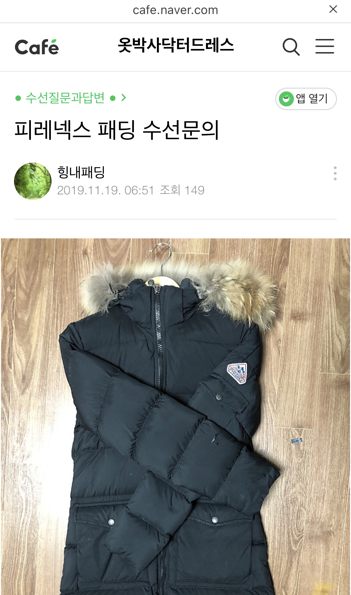 후기가 많긴 했으나, 피레넥스 패딩에 대한 수선 사례는 없어, 수선 가능여부와 가격을 확인하기 위해 카페에 사진을 찍어 견적을 문의하였다.