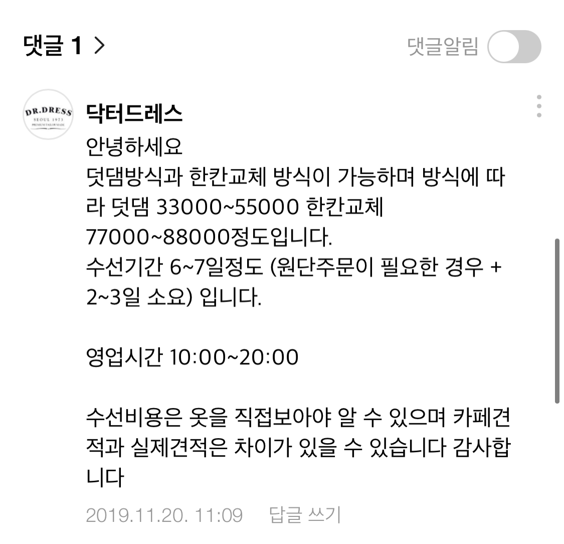 일단 위와 같은 답변이 달렸기에, 집에서도 멀지 않으니, 직접 패딩을 가지고 방문해보기로 했다! 방문 결과, 덧댐 방식은... 내 기준엔 너무 티가 날 것 같아서 (작은 조각을 위에 덮어서 꿰매는 방식) 한칸 교체 방식으로 진행하기로 결정. 다만 패딩 안에 여분의 천이 나올 만한 곳이 없어서 (주머니 안감 등을 확인 하심) 그나마 비슷한 천으로 진행해주겠지만 완전 같을 수는 없다고 말씀해주심. 어쩔 수 없다고 생각하며... 수선을 맡기고 받는 것은 택배로 요청해두었다. 택배비 별도 지불이 필요했고 수선비용까지 다 합쳐서 8만원에 해주셨다.